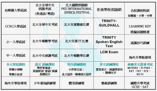 中、英、法語特訓, 朗誦演講, 面試技巧, 考試預備班, 國際升學銜接班, 精選特式課程, 學科特訓課程 |